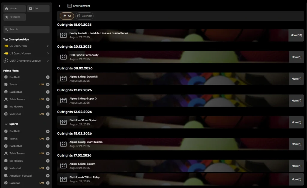 - Obrovského výběru: Více než 100 000 událostí napříč širokou škálou sportů a esportů, což zajišťuje, že si vždy najdete něco, na co vsadit.